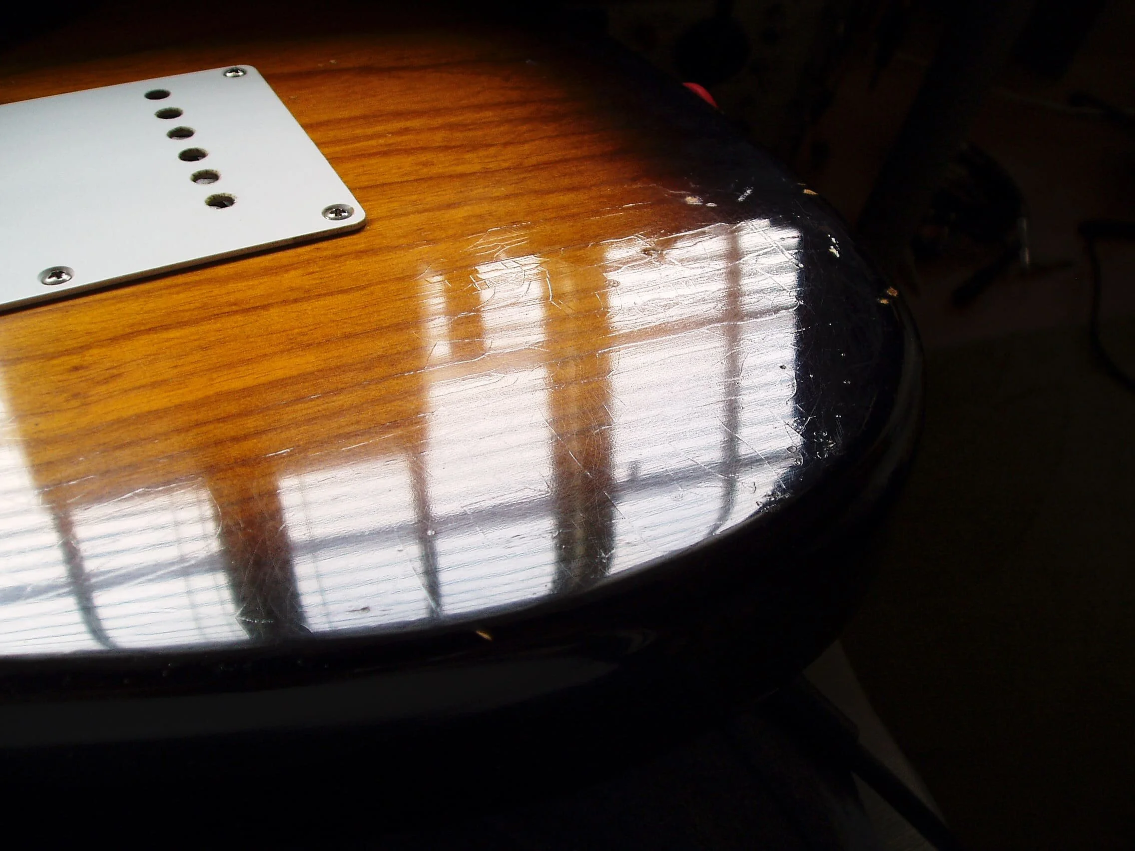 It’s a subtle effect but the ‘shadow’ of the pickguard can be seen after light tint clear was sprayed.